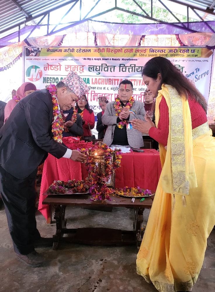 कार्यक्रममा प्रमुख अतिथिको आसनवाट वोल्दै वित्तीय संस्थाका संस्थापक अध्यक्ष एवम् नेपाली कांग्रेस पर्वतका नेता डा. विश्व प्रकाश प्रसाईले २७ वर्ष पहिले देशमा द्वन्द चरम उत्कृर्षमा पुगेको, गाँउले वजारमा अवस्थित वैंकका शाखाहरु र सरकारी सेवा केन्द्रहरु सदरमुकाम केन्द्रित रहेको, साहुमहाजनले समेत गरिव विपन्न परिवारलाई ऋण सापटी नदिने अवस्थामा पर्वत जिल्लाको गाँउगाँउमा नेष्डो नेपाल पुगेर विना धितो कर्जा दिई महिलाहरुलाई जीविकोपार्जनमा टेवा पु¥याएको वताउनु भयो । देशमा झण्डै ५३ लाख लघुवित्तका सदस्य मध्ये ३३ लाखले लघुवित्त संस्थावाट कर्जा लिएको भन्दै क्षमता नहेरी कर्जा लिने, लिएको कर्जा सदुपयोग नगरेको कारण समयमा किस्ता तिर्न नसक्ने केही सदस्यले लघुवित्त संस्था विरुद्ध अपवाह फैलाएको भनणदै अफवाहका पछि नलागी ईमान्दारीका साथ कारोवार गर्न सदस्यलाई अनुरोध गर्नु भयो । प्रमुख अतिथि प्रसाईले अनुशासन पुर्वक वित्तीय कारोवार नगर्ने सदस्यको वारेमा राजनीतिक दल समेत भ्रममा रहेको भन्दै भ्रममा नलागी असल सदस्यको पक्षमा उभिन अनुरोध गर्नु भयो । प्रसाईले अमेरीकी सहयोग वन्द भएको र सम्पत्ति सुद्धीकरणको सन्दर्भमा देश ग्रे लिष्टमा सुचिकृत भएसंगै भविस्यमा आउन सक्ने वित्तीय संकटवाट लघुवित्तलाई प्रभावित हुन नदिन सदस्यहरुमा अनुशासन र इमान्दारिताको जरुरी भएको वताउनु भयो। उहाँले ठुला वैंकहरुले व्यवसाय सुरक्षणमा जोड दिने भएता पनि लघुवित्तले सदस्य दिदीवहिनीको जीवन र सामाजिक प्रतिष्ठालाई ध्यान दिंदै मृत्यु पश्चात् कर्जा मिनाह, तिरेको रकम फिर्ता र क्रिया खर्च सुविधा समेत दिंदै आएको वताउनु भयो ।