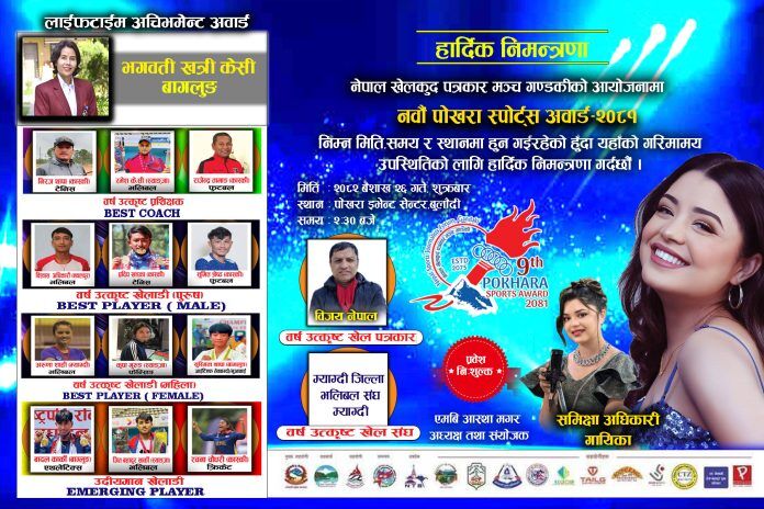 बैशाख २६, पोखरा – ‘नवौं पोखरा स्पोर्ट्स अवार्ड २०८१’ को अवार्ड कार्यक्रम आज (शुक्रबार) हुँदैछ । नेपाल खेलकुद पत्रकार मञ्च गण्डकीको आयोजनामा हुने अवार्ड कार्यक्रम पोखरा इभेन्ट सेन्टरमा दिनको ३ बजे शुरु जनाइएको छ ।