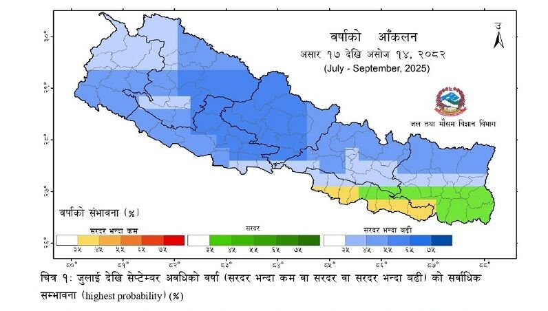 अद्यावधिक आँकलन अनुसार अबका तीन महिना मधेसका दक्षिणी भागमा सरदरभन्दा कम वर्षा हुनेछ । मनसुनको एक महिना बित्दा पनि मधेसमा उल्लेखनीय वर्षा हुन सकेको छैन । त्यस्तै अबका तीन महिना कोशीका दक्षिणी भागमा सरदर पानी पर्ने र देशका बाँकी भागमा सरदरभन्दा बढी वर्षा हुने सम्भावना छ ।