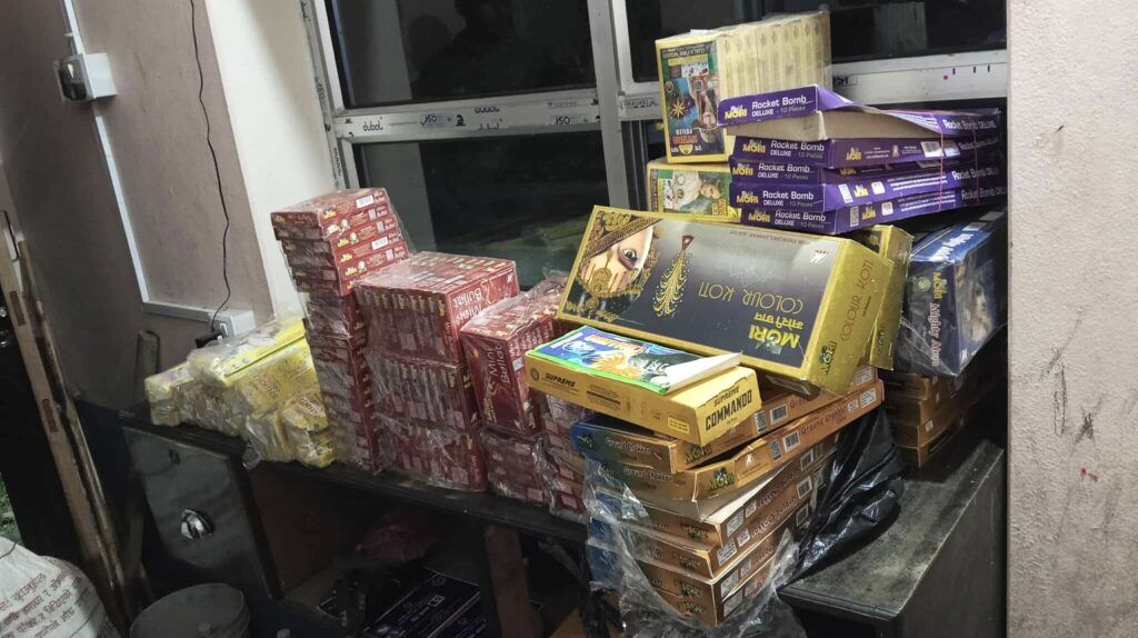 सूचना अधिकारी प्रहरी नायब उपरीक्षक प्रसन्न राज चौधरीका अनुसार रकेट बम चार प्याकेट, कमाण्डो ग्रीर बम एक प्याकेट, कलर कोटि दुई प्याकेट, ग्राउन्ड चक्कर ११ प्याकेट, मिनि बुलेट ७५ प्याकेट, माइट्टी एटम पाँच प्याकेट, हाइड्रोफोल्ड पचास प्याकेट, शिखा कलर तीस प्याकेट र चोइसा क्र्याकर्स ८ सय ५० प्याकेट पटका बरामद भएका हुन् ।