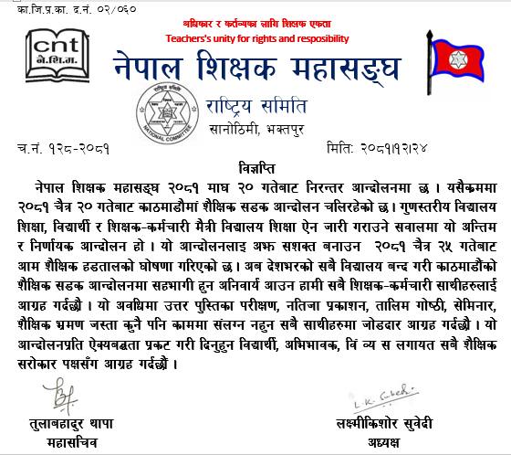 विद्यालयका शिक्षक–कर्मचारी यही चैत २० गतेदेखि काठमाण्डौ केन्द्रित आन्दोलनमा छन् । उनीहरुले अहिलेको अवस्थामा संसदको वर्षे अधिवेशन तत्कालै शुरू गर्ने, विशेष अधिवेशन आह्वान गर्ने वा अध्यादेश जारी गर्नेमध्ये एउटा विकल्पमार्फत जतिसक्दो छिटो विद्यालय शिक्षा ऐन जारी गर्नुपर्ने माग गरेका छन् ।